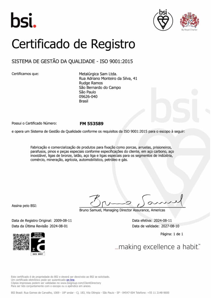 A empresa produz porcas sob desenho desde 1964. Com o foco nestes mercados a Metalúrgica Sam obteve em 2009 a certificação da ISO 9001.